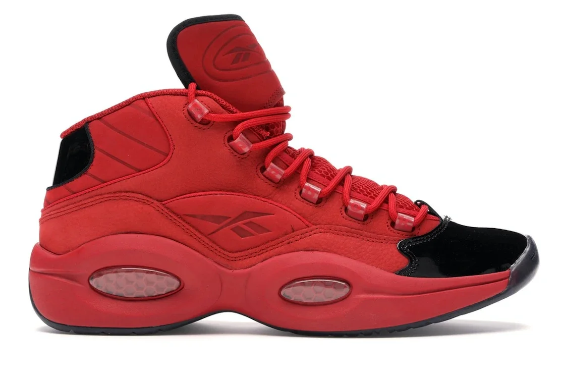 The Reebok Question Mid Heart Over Hype serves as a reintroduction of Allen Iverson's iconic Question Mid, which was his initial signature shoe launch with Reebok during the 1996-97 season. The Reebok Question Mid Heart Over Hype upper is crafted from red tumbled nubuck, complemented by glossy black patent leather on the heel tab and toe cap, while debossed Vector logos grace the tongue and quarter panel overlay. Symbolizing Iverson’s mindset of prioritizing energy, passion, and determination, the bold red-and-black colorway takes center stage. Embracing a minimalist approach with its logos and ghillie lacing system, the mid-top silhouette rests on a coordinating red EVA midsole equipped with Reebok's visible Hexalite cushioning for lightweight shock absorption. The design is completed with a rubber outsole. The distinguishing feature of the Reebok Question Mid Heart Over Hype lies in its red-and-black color combination, emblematic of Iverson’s ethos, valuing energy, passion, and determination over showiness or flamboyance. The sneaker retailed for $150 when it was released on the 23rd of December, 2019. - Style FW5304 - Colorway Black/Scarlet-Gold Metallic - Retail Price 150 - Release Date 2019-12-23 - Featured false