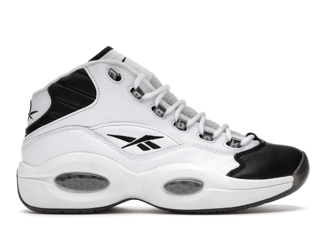 The Reebok Question Mid Why Not Us commemorates an inspiring postgame speech by Allen Iverson after leading his team to recover a 21-point deficit in nine minutes during the 2001 All-Star Game in Washington, DC. While the Reebok Question Mid arrives in a white colorway, the front has a black leather toe cap contrasting the rest of the shoe. The quarters feature several overlays, all in white, with the Vector logo appearing in black near the sole. Black and white panels cover most of the heel, leaving a cut-out at the counter where an embroidered question mark appears alongside the Vector motif. This shoe sits on a white midsole with black DMX cushioning at the heel and a translucent outsole. The heel displays a black patch with a bold "3" in white, paying homage to Iverson’s jersey number. The throat of the Reebok Question Mid Why Not Us is among its most outstanding features. It features black webbed eyelets adorned with a white letter to spell Reebok. This shoe was released on March 6th, 2021, for $140. - Style GX5260 - Colorway White/Black - Retail Price 140 - Release Date 2021-03-06 - Featured false