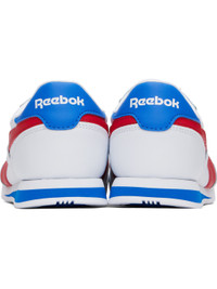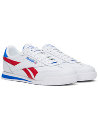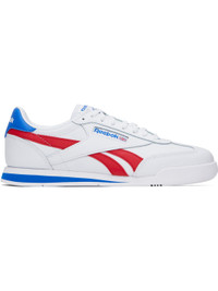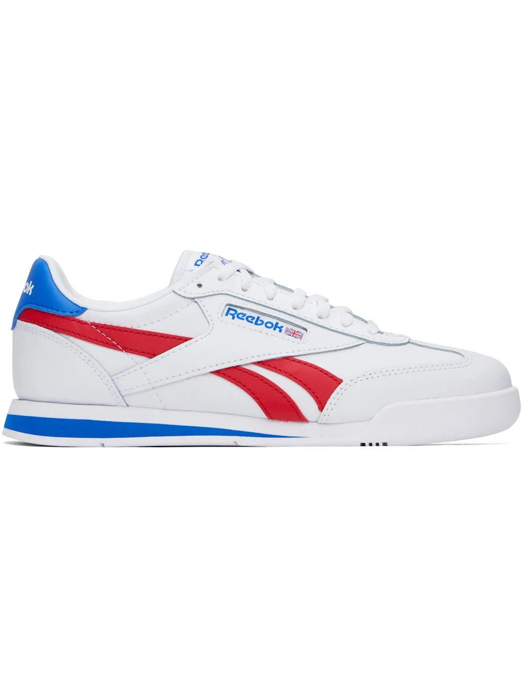 Low-top coated leather sneakers in white and blue. · Lace-up closure · Logo patch at padded tongue · Padded collar · Inset logo patch at outer side · Signature stripes at sides · Logo printed at heel tab · Jersey lining · Treaded rubber sole Supplier color: White/Vectorred/Optimumblue Upper: leather. Sole: rubber. Made in Viet Nam 251749M237082