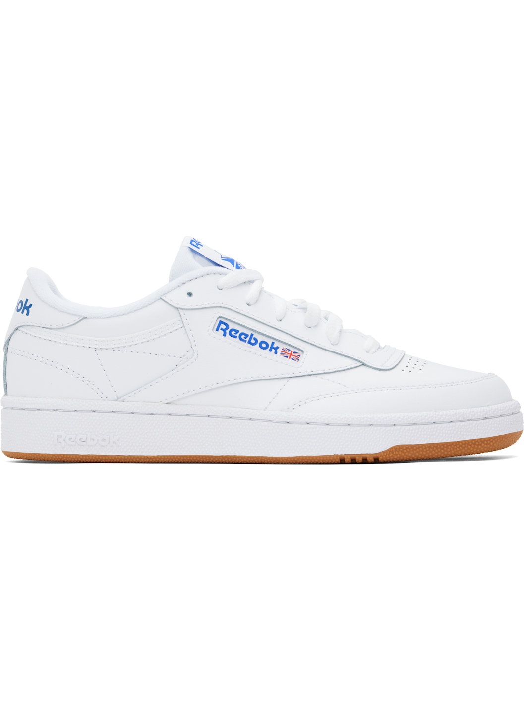 Low-top grained leather sneakers in white. · Perforated detailing at toe · Lace-up closure · Logo flag at padded tongue · Padded collar · Inset logo patch at outer side · Logo printed at heel collar · Terrycloth lining · Treaded rubber sole Supplier color: Int white/Royal gum