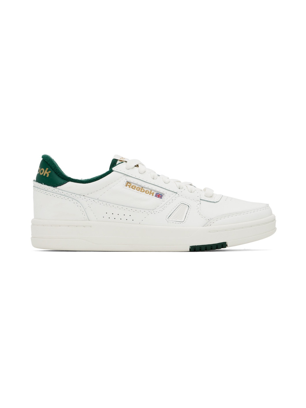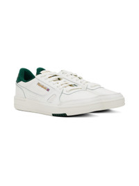 Low-top grained leather sneakers in white. · Perforated detailing throughout · Lace-up closure · Logo patch at padded tongue · Padded collar · Inset logo patch at outer side · Rubberized patch at sides · Gold-tone logo stamp at heel tab · Terrycloth lining · Treaded rubber sole Supplier color: Chalk/Vintage chalk/Green
