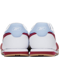Low-top coated leather sneakers in white and red. - Suede trim at toe - Lace-up closure - Logo patch at padded tongue - Padded collar - Inset logo patch at outer side - Signature stripes at sides - Logo printed at heel tab - Buffed leather lining - Treaded rubber sole Supplier color: White/Veryberry/Y2kblue