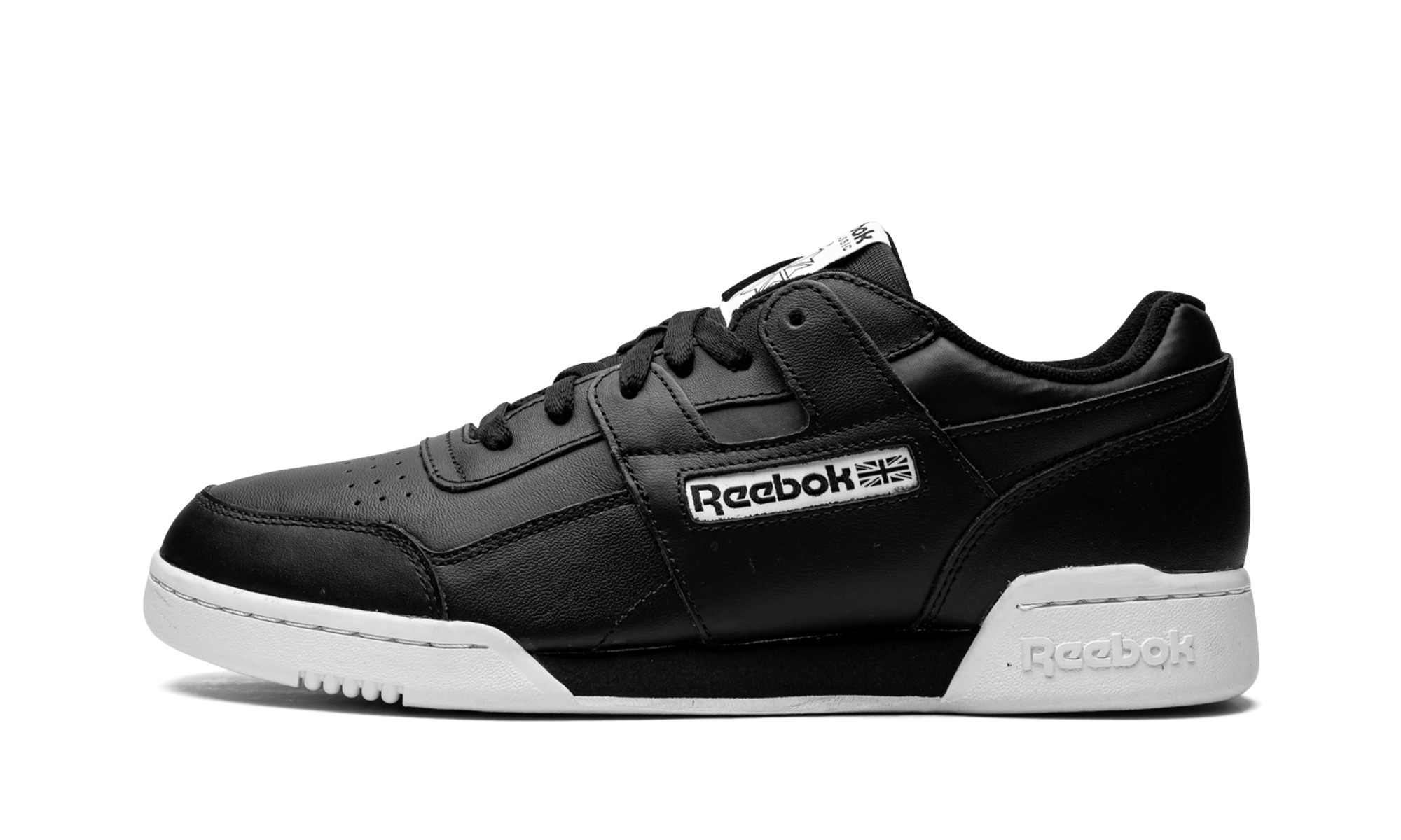 Black/white leather Workout Plus low-top sneakers from REEBOK featuring panelled design, branded insole, perforated toebox, flat rubber sole, front lace-up fastening and logo patch to the side. These styles are supplied by a premium sneaker marketplace. Stocking only the most sought-after footwear, they source and curate some of the most hard to find sneakers from around the world..
