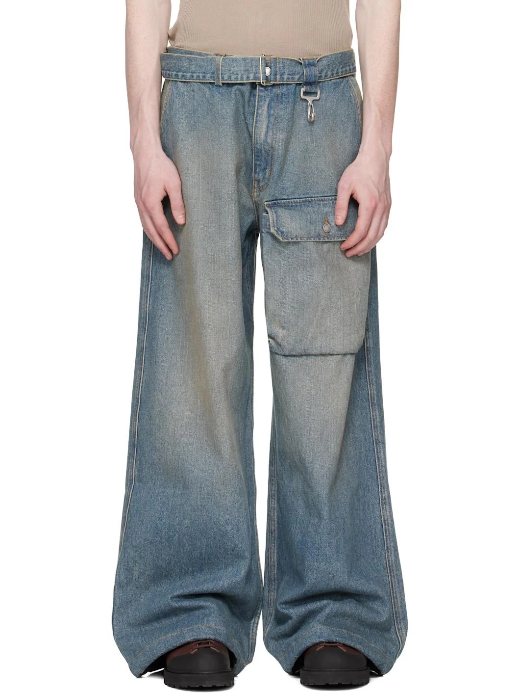 Blue Washed Denim Patch Pocket Belted Cargo Jeans