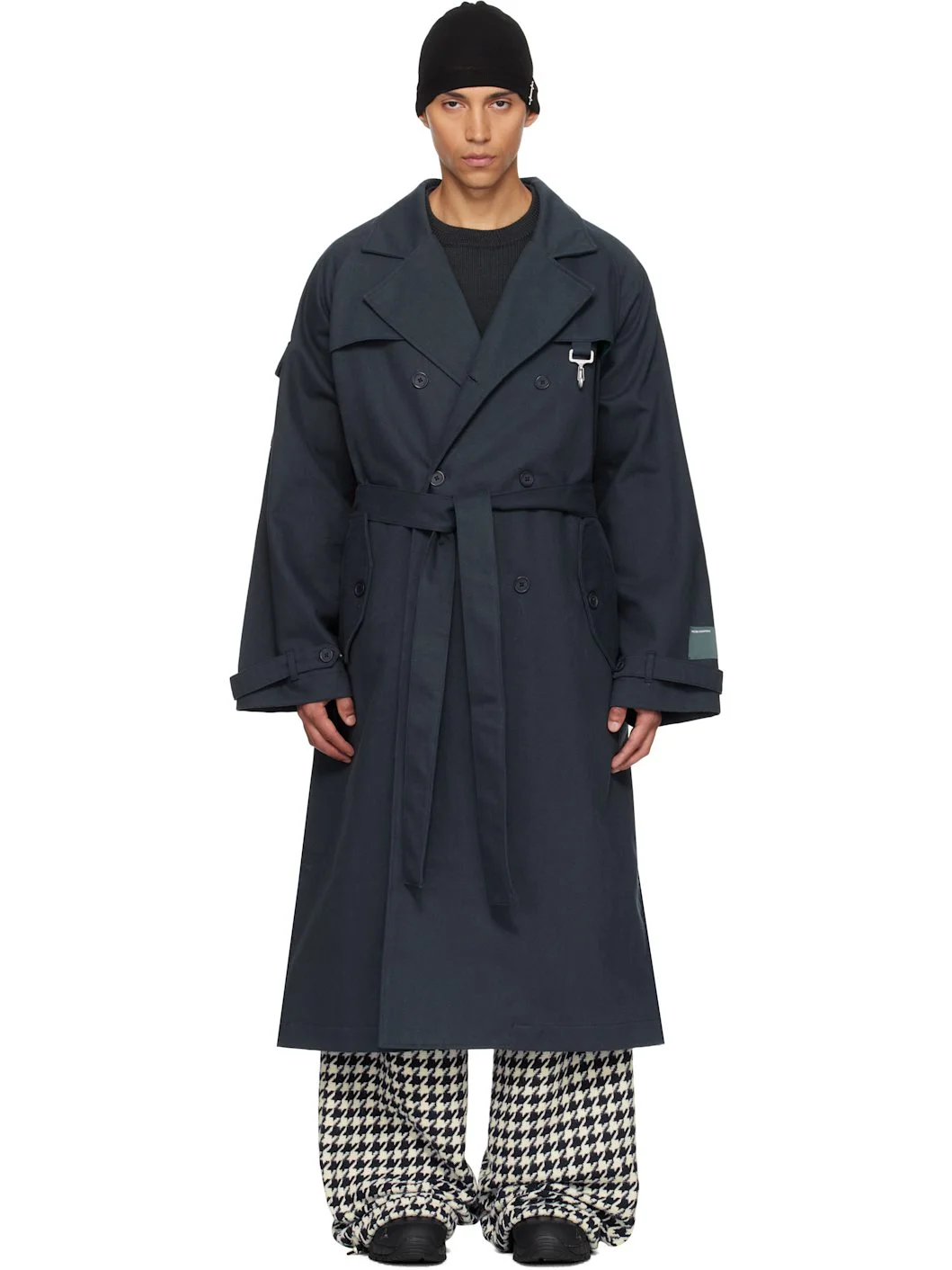 Cotton twill trench coat. · Notched lapel · Double-breasted button closure · Logo-engraved clasp at chest · Flap pockets at front and sleeve · Belt loops and detachable self-tie belt at waist · Raglan sleeves · Adjustable button strap at cuffs · Storm flap at back · Partially lined Supplier color: Navy Body: 100% cotton. Lining: 100% rayon. Made in United States 252115M184000