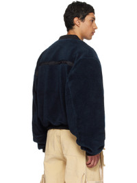 Sherpa fleece bomber jacket. · Heavyweight · Rib-knit stand collar, hem, and cuffs · Cinch strap and logo-engraved clasp at chest · Flap pockets at front · Logo patch at cuff · Full mesh lining Supplier color: Navy/Black Body: 100% polyester. Trim: 98% cotton, 2% lycra. Lining: 100% polyester. Made in United States 252115M175000