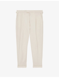 PRODUCT DETAILS - Reiss cotton-blend trousers - 52% cotton, 44% viscose, 4% elastane - Hook-and-eye and zip-fly fastening - Regular fit, mid-rise, tapered leg, side adjusters, side pockets, turn-up cuffs - Machine wash mild - True to size - Model is 6ft 1in/1.85m and wears a size UK 32 - Lightweight, slight stretch Ref: R04398247