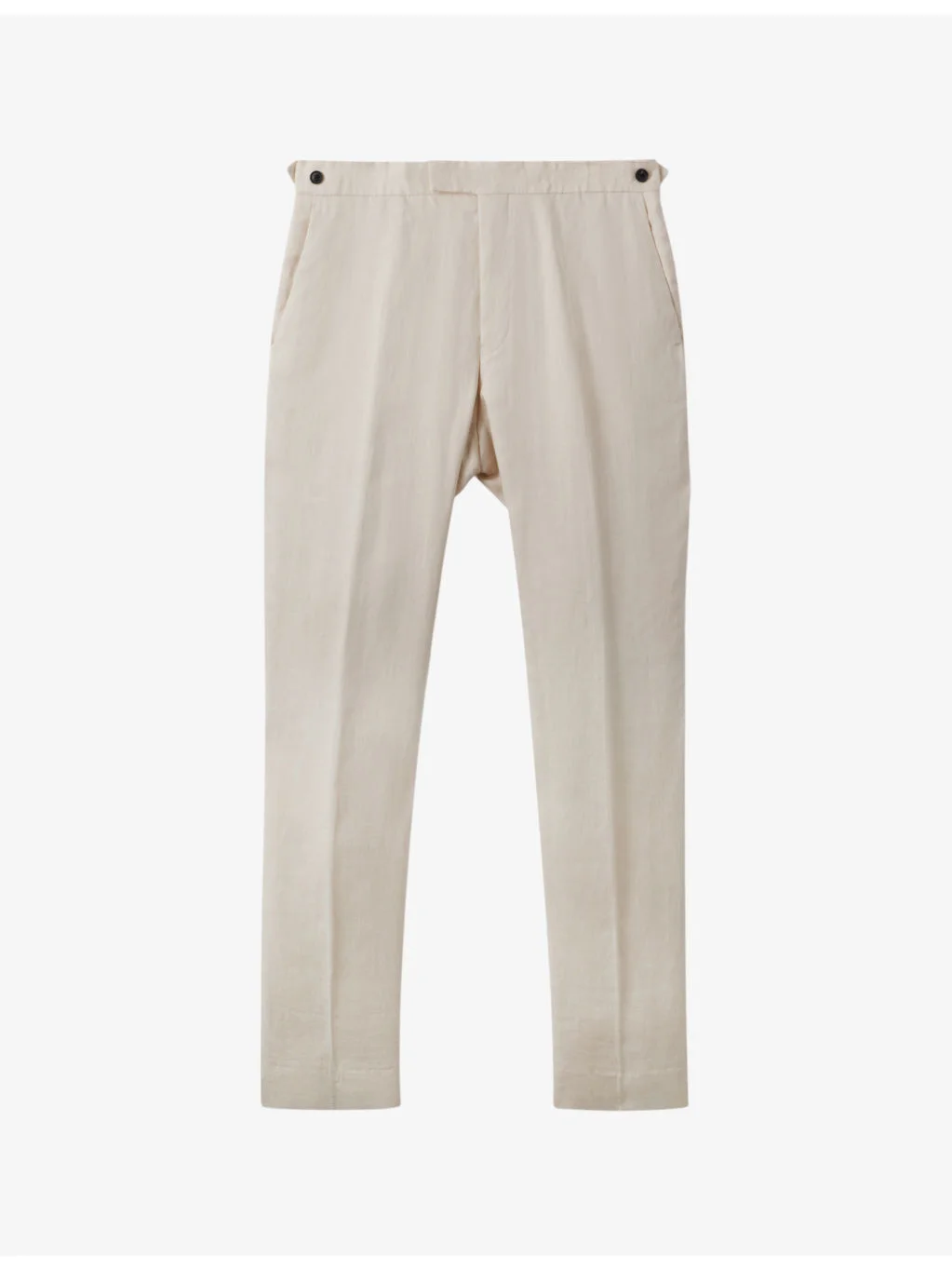 PRODUCT DETAILS - Reiss linen trousers - 100% linen - Concealed button and zip-fly fastening at front - Slim fit, side adjusters, two slip pockets at sides, pressed crease at front - Dry clean - Midweight, non-stretch