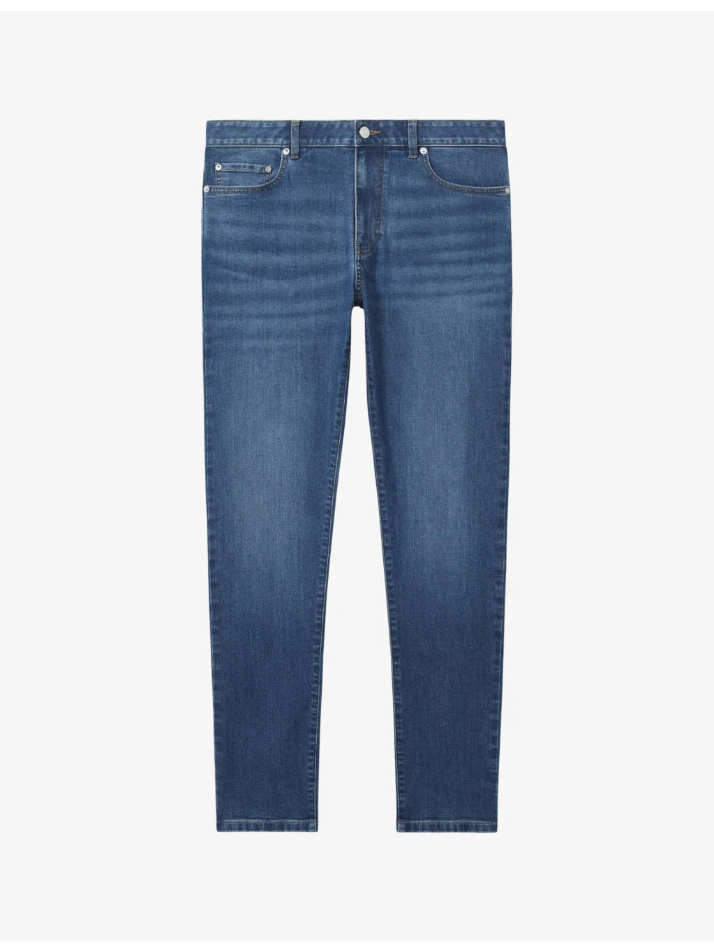 PRODUCT DETAILS - Reiss denim-blend jeans - 78% cotton, 21% polyester, 1% elastane - Exposed button and concealed zip-fly fastening at front - Slim fit, mid-rise, tapered leg, belt loops, classic five pockets, mid-wash - Machine wash cold - Midweight, slight stretch Ref: R04343694