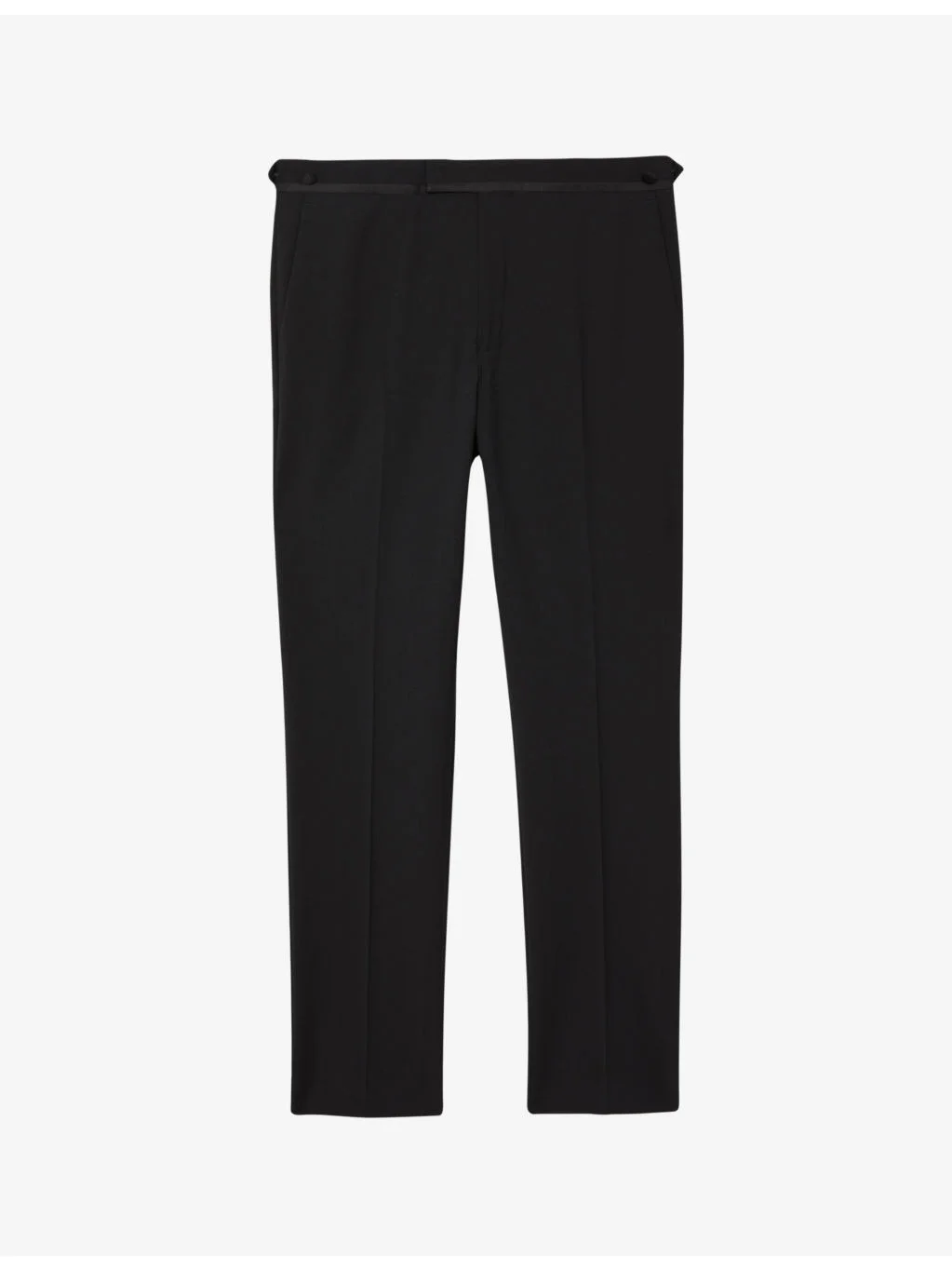 PRODUCT DETAILS - Reiss stretch-wool blend tuxedo trousers - 55% wool, 41% recycled polyester, 4% elastane; lining 100% acetate - Button, hook-and-eye and zip-fly fastening - Slim fit, mid-rise, satin trim at waist, adjusting tabs at side waistband, two side slip pockets, centre pressed creases, two welt pockets at back, fully lined, spillage and water-resistant material, crease-resistant - Dry clean only - Model is 6ft 2in/1.88m and wears a size UK 32 - Midweight, stretchy