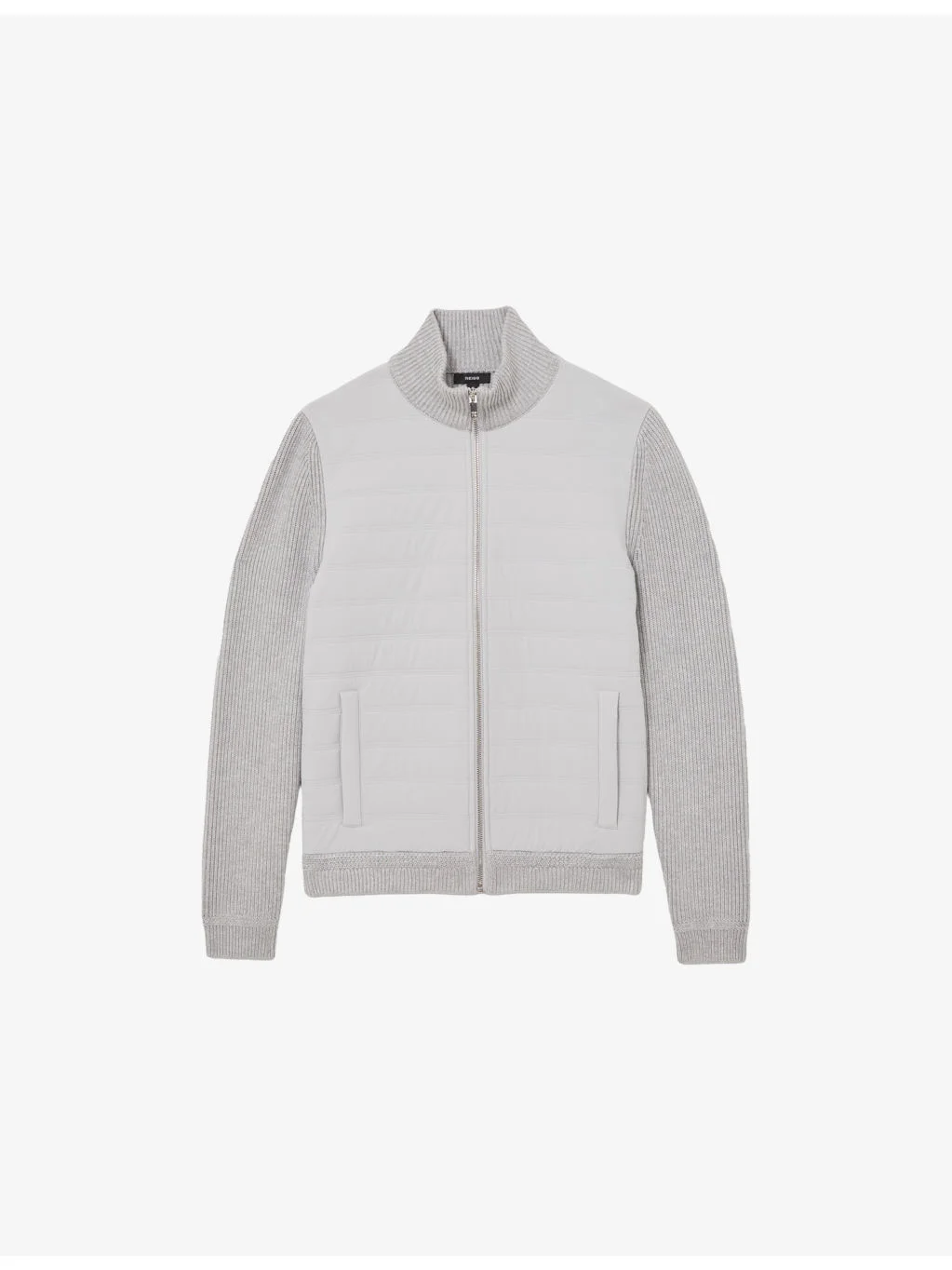 PRODUCT DETAILS - Reiss ribbed-knit jacket - 85% nylon, 15% elastane - Exposed zip fastening at front - Regular fit, funnel neck, long ribbed-knit sleeves, quilted body, two pockets at the side - Hand wash - Midweight, slight stretch Ref: R04486106