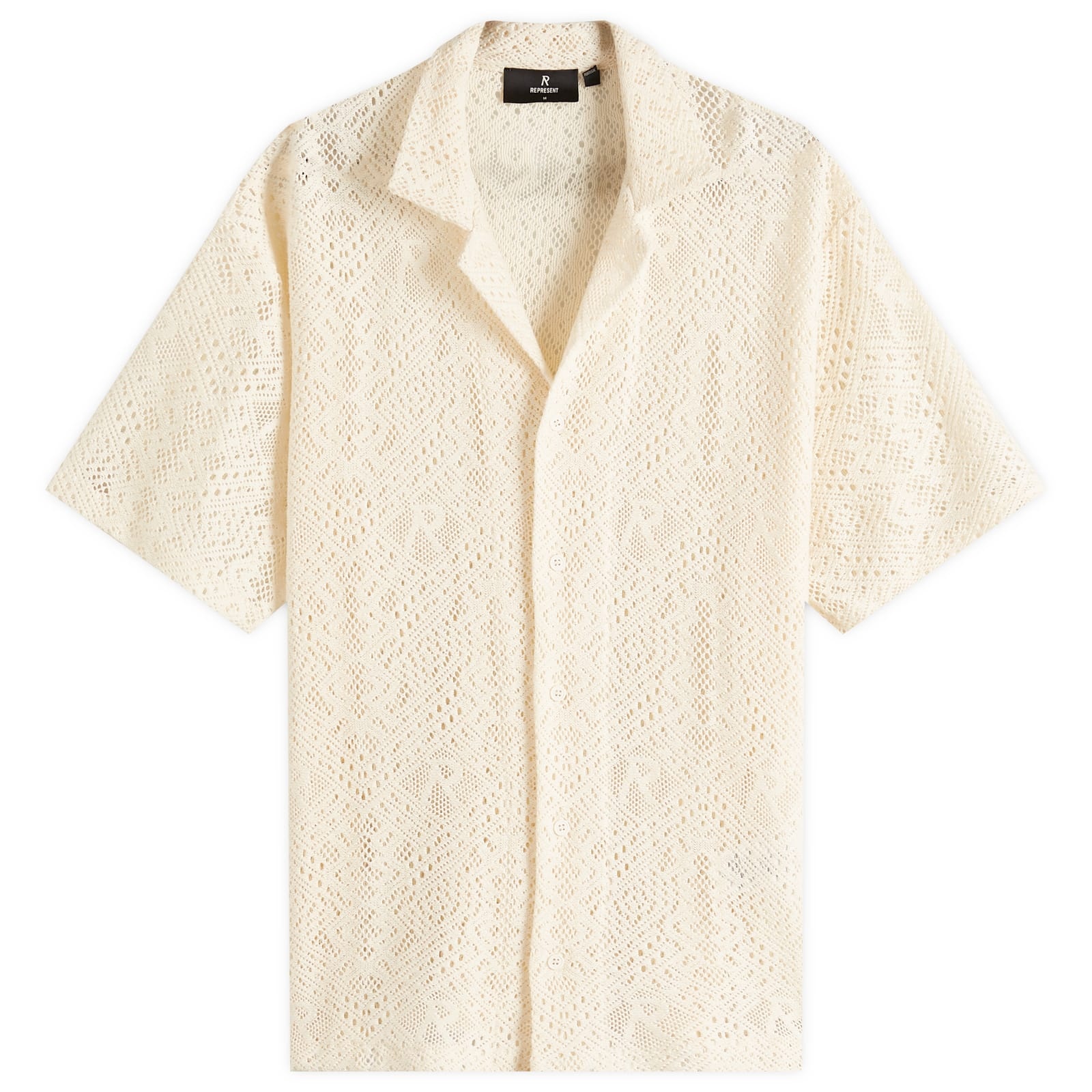 This Represent all over crochet shirt in Off White is a statement of craftsmanship and airy comfort. Made from undyed open-knit crochet, it features a textured ‘R’ monogram pattern woven throughout. With a camp collar, tonal button fastening and oversized fit, this breathable shirt is perfect for layering in warm weather. - 75% Cotton, 25% Polyamide - Oversized Fit - Undyed Open Knit Crochet - Camp Collar - Monogram ‘R’ Branding - Product Code: MLM3837-26