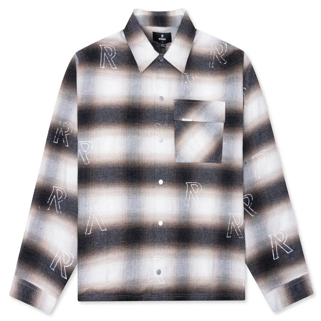The All Over Initial Flannel from Represent is made from a viscose, wool, and more that is soft to the touch. This piece features cobrax popper closure and a classic collar for a versatile look. A chest pocket adds functionality, and woven brand tag provides a subtle branded touch. - 35% Viscose, 29% Wool, 19% Polyester, 15% Cotton, 2% Nylon - Brushed flannel - Classic collar - Cobrax popper closure - Chest pocket - Accented with allover printed 'R' initial - Metal Represent bar logo - Style No: MLM100778-0146