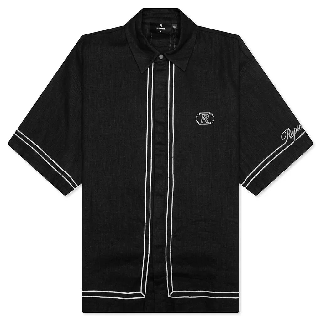 Perfect for warm weather, upgrade your wardrobe with the Border Shirt from Represent. Lightweight and breathable with a soft, natural drape, the shirt is made from ramie. Featuring a contrast border detailing throughout the shirt with a large initial logo on the back. Clean lines meet sharp tailoring with a hidden front placket. The Represent script embroidery at the sleeve seals the look with refined edge. Complete the outfit by pairing this shirt with the matching Border Shorts. - 100% Ramie - Relaxed fit - Contrast border detailing - Oversized initial graphic on the back - Structured collar - Concealed poppers under front placket - Represent script logo - Style No: MLM100298-01