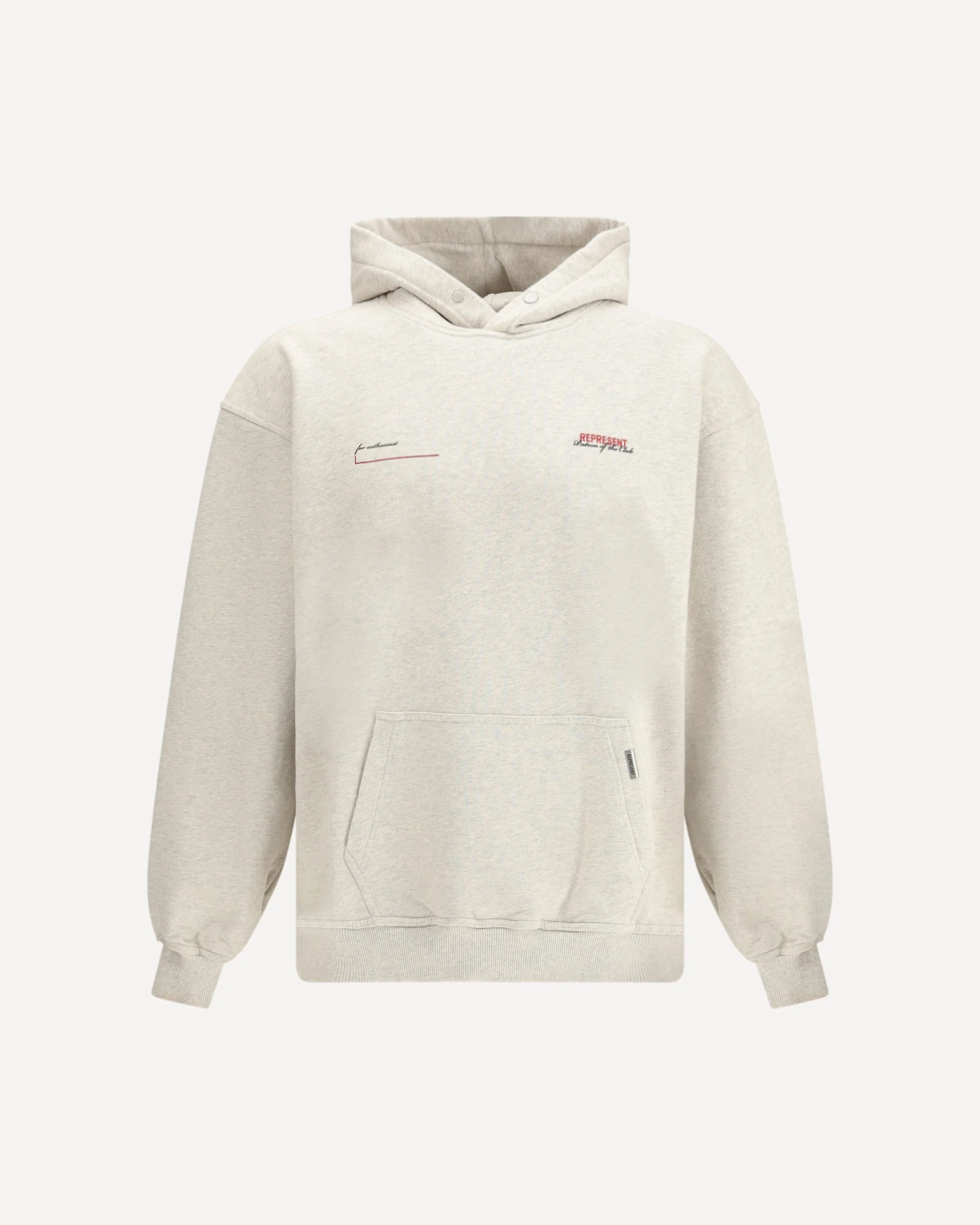 The cotton Hoodie by Represent is a casual garment with a modern design. It features an adjustable hood with magnetic button closure, ribbed cuffs and a ribbed hem for a comfortable fit. The front kangaroo pocket adds practicality, while the brand's iconic monogram, printed in contrast on the front and back, enhances its identity. The regular fit makes it versatile and perfect for any streetwear look. DETAILS - Sku: MLM4270_CREAMMARL - Season: SS26 - Fit: Regular - Composition: GENERAL 100% Cotton - MADE IN PORTUGAL