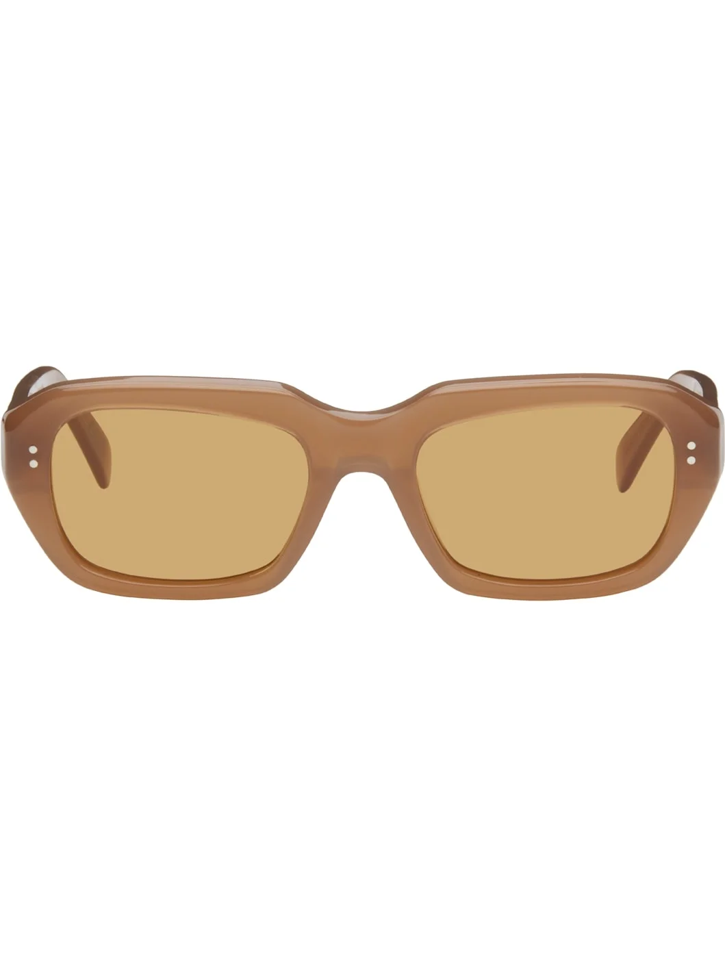 Rectangular semi-transparent acetate-frame sunglasses in brown. · Handcrafted · Brown lenses, category 2 · Integrated nose pads · Rivets and inset logo hardware at temples · Exposed core wires · Includes pouch · Size: 54.20 145 Supplier color: Cola Acetate. Made in Italy 252191M134039
