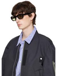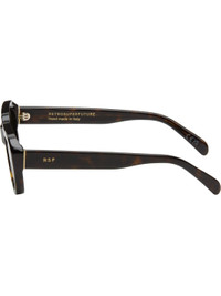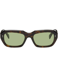 Rectangular semi-transparent tortoiseshell acetate-frame sunglasses in brown. · Handcrafted · Green lenses, category 2 · Integrated nose pads · Rivets and inset logo hardware at temples · Exposed core wires · Includes pouch · Size: 54.20 145 Supplier color: 3627 Acetate. Made in Italy 252191M134040