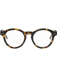 Handcrafted round semi-transparent tortoiseshell acetate-frame optical glasses in brown. · Integrated nose pads · Inset logo hardware at temples · Includes pouch · Size: 48.21 145 Supplier color: Burnt Havana Acetate. Made in China 252191M133010