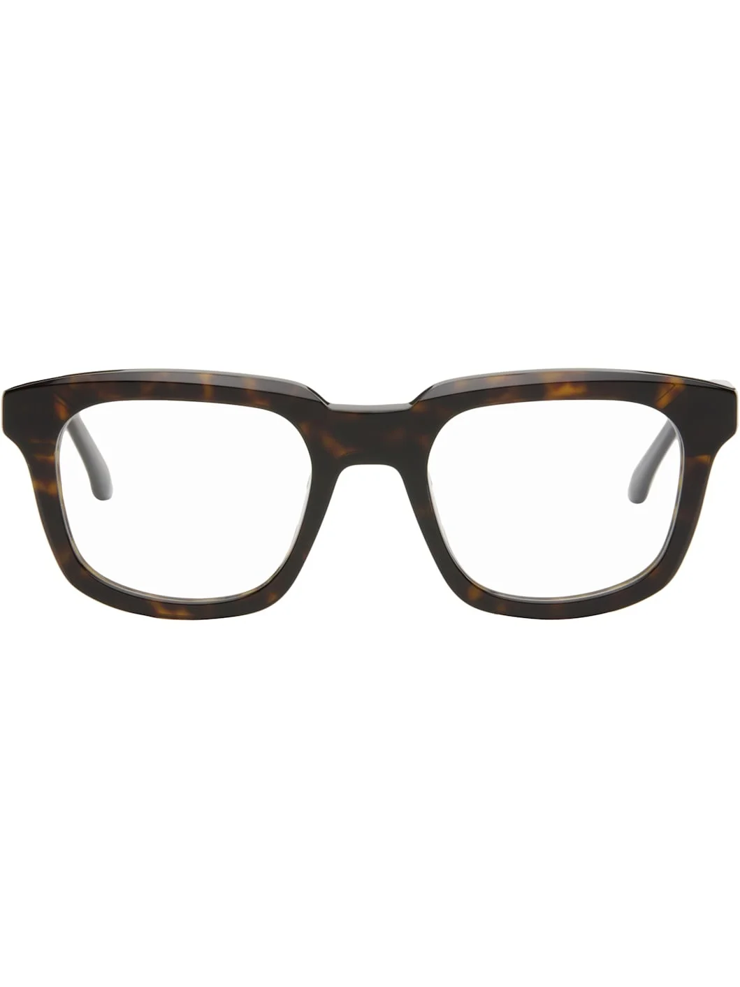 Handcrafted square semi-transparent tortoiseshell acetate-frame optical glasses in brown. · Integrated nose pads · Inset logo hardware at temples · Exposed core wires · Includes pouch · Size: 50.21 145 Supplier color: Havana Acetate. Made in China 252191M133005