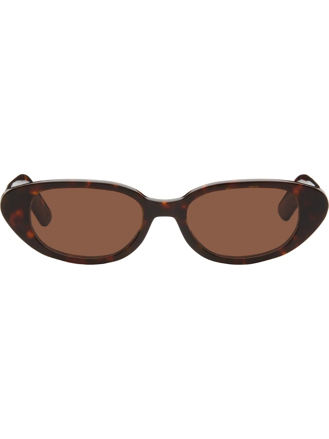 Cat-eye semi-transparent tortoiseshell acetate-frame sunglasses. · Brown lenses · Integrated nose pads · Logo hardware at temples · Core wires · Includes pouch · Size 51.18 145 Supplier color: Burnt Havana Acetate. Made in China 261191M134026