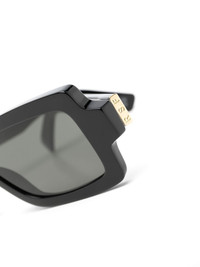 rectangle-frame sunglasses black acetate gold-tone hardware tinted lenses straight arms These glasses come with a protective case. Made in Italy Composition Acetate 100% SIZE & FIT Measurement Arm Length 5.7 in(14.5 cm) Bridge Width 0.7 in(1.8 cm) Lens Diameter 2.12 in(5.4 cm) Total Width 5.9 in(15 cm)
