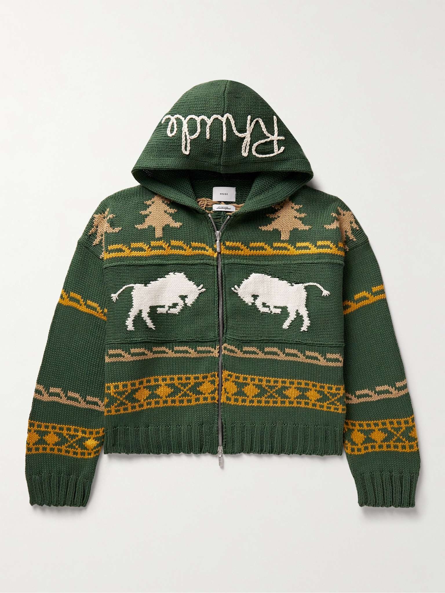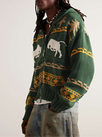 Rhude's designs heavily feature car references, so it was only fitting the latest collection was created in collaboration with Automobili Lamborghini. This cotton-blend cardigan is jacquard-knitted with a nature-inspired motif that incorporates the luxury manufacturer's iconic bull emblem. Size & Fit - Model wears a size larger to achieve a looser fit - Mid-weight knit - Model is shown wearing a L - Model measures: chest 38"/ 96cm, height 6'2"/ 188cm Details & Care - Multicoloured cotton-blend jacquard - Two-way zip fastening - 50% cotton, 50% polyester - Dry clean