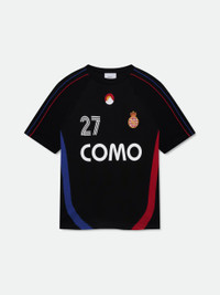 Premium tee crafted from soft, lightweight fabric. Rhude Como 27 jersey graphic showcased on the front. Features a comfortable and relaxed custom Rhude fit. The multi stripe design on the sleeves adds a sporty touch to this classic short sleeve. 100% COTTON JERSEY