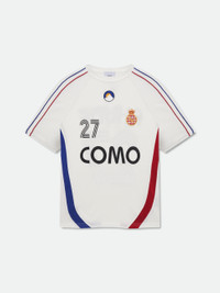 Premium tee crafted from soft, lightweight fabric. Rhude Como 27 jersey graphic showcased on the front. Features a comfortable and relaxed custom Rhude fit. The multi stripe design on the sleeves adds a sporty touch to this classic short sleeve. 100% COTTON JERSEY
