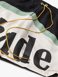 Premium washed cupro/poly blend flight short with RHUDE logo print across front legs. Twin pockets at sides. Extended drawstrings in our signature mustard tone. SIZING Standard fit - We recommend taking your standard size.