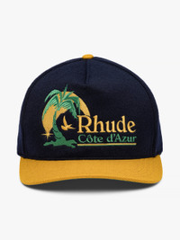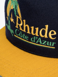 Heavyweight cotton hat with "Rhude - Cote D'Azur" inspired designs embroidered on the front. Features an adjustable strap at the back, so you can adjust the fit to your preference, and green under brim. 100% COTTON / 100% POLY Spot clean with distilled soapy water. One size fits all.