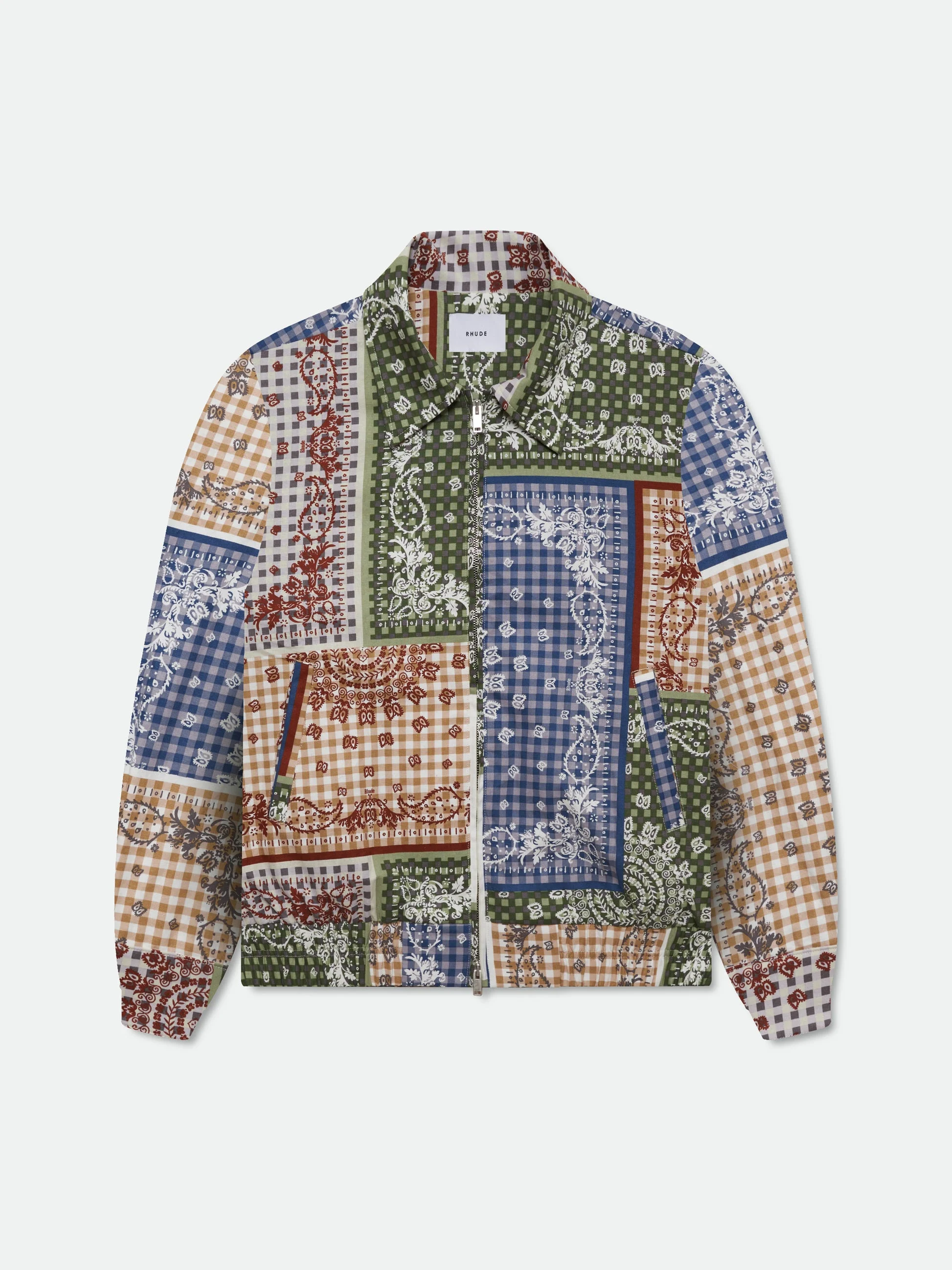 Premium jacket signature bandana patchwork printed throughout the jacket. Twin patch pockets at front. Two-way zipper closure with custom Rhude Pill hardware. 55% LINEN 45% COTTON