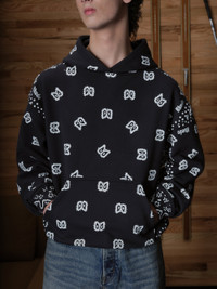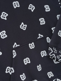 Long sleeve heavyweight cotton hoodie with all over bandana motif pattern printed throughout. Featuring a kangaroo front pocket and dropped shoulders. Each piece is unique and print distressing my vary per style. 100% COTTON STANDARD FIT.