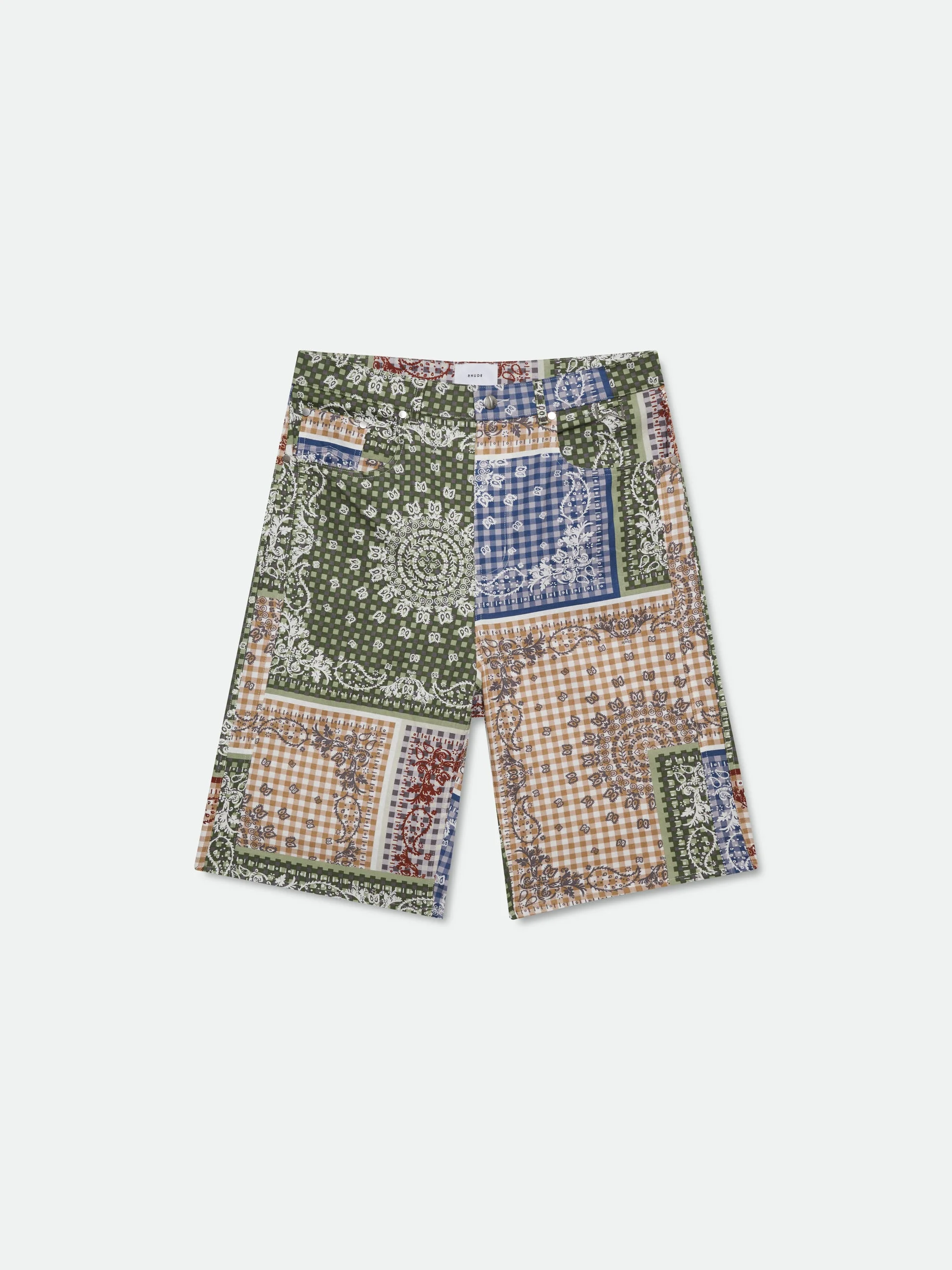 Crafted from premium linen cotton blend, our shorts provide a comfortable fit that flexes with your movements. These shorts feature our bandana patchwork designs throughout, a mid-rise design with signature seamlines, adorned with a premium leather back patch and custom Rhude Closure button & hardware. 55% LINEN 45% COTTON