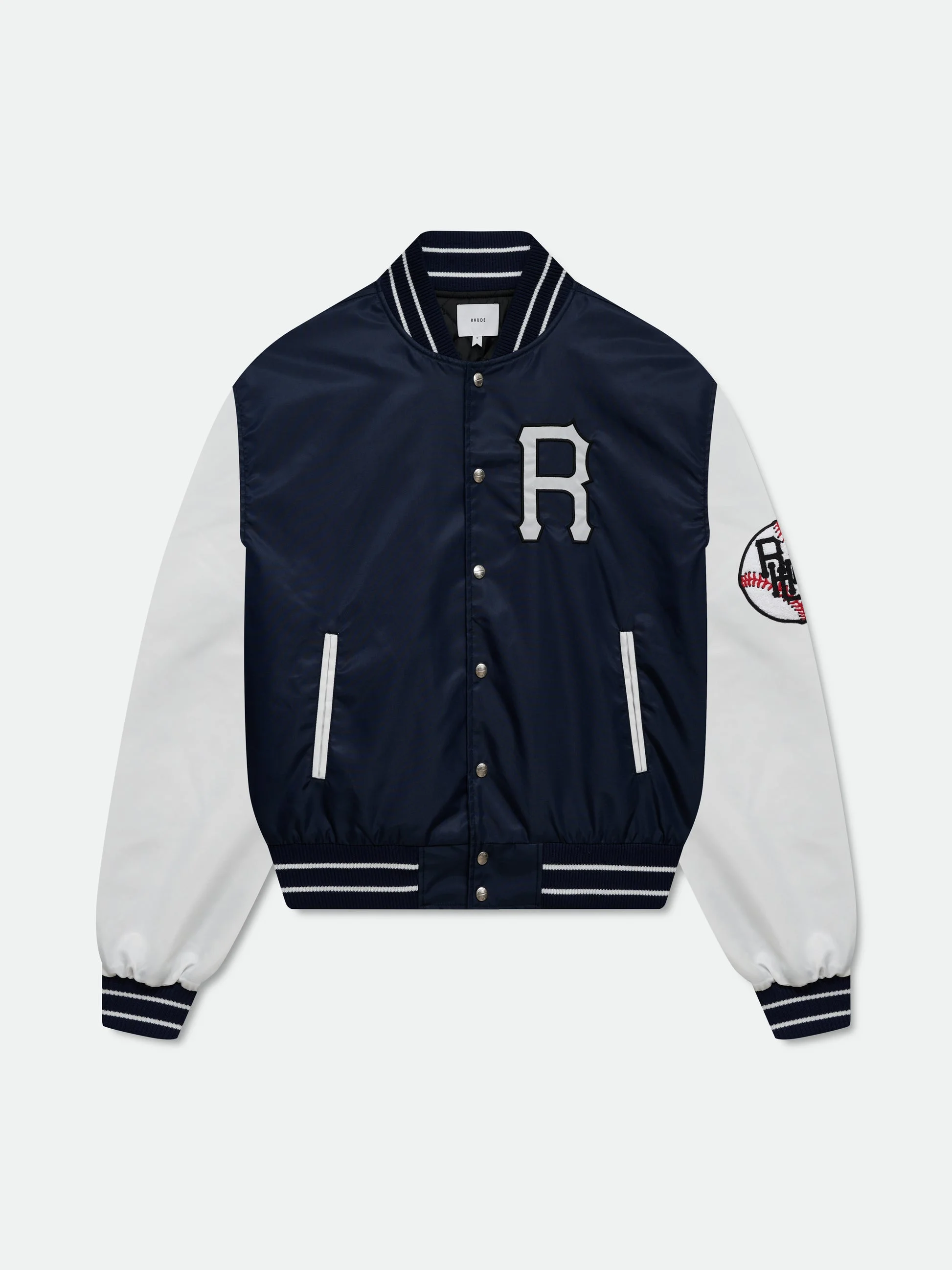 Batting Cage varsity bomber jacket with R embroidered letter on front, with RHUDE logo on the back. Includes a custom Rhude button closures, stand collar, and ribbed waist and cuffs. 100% NYLON