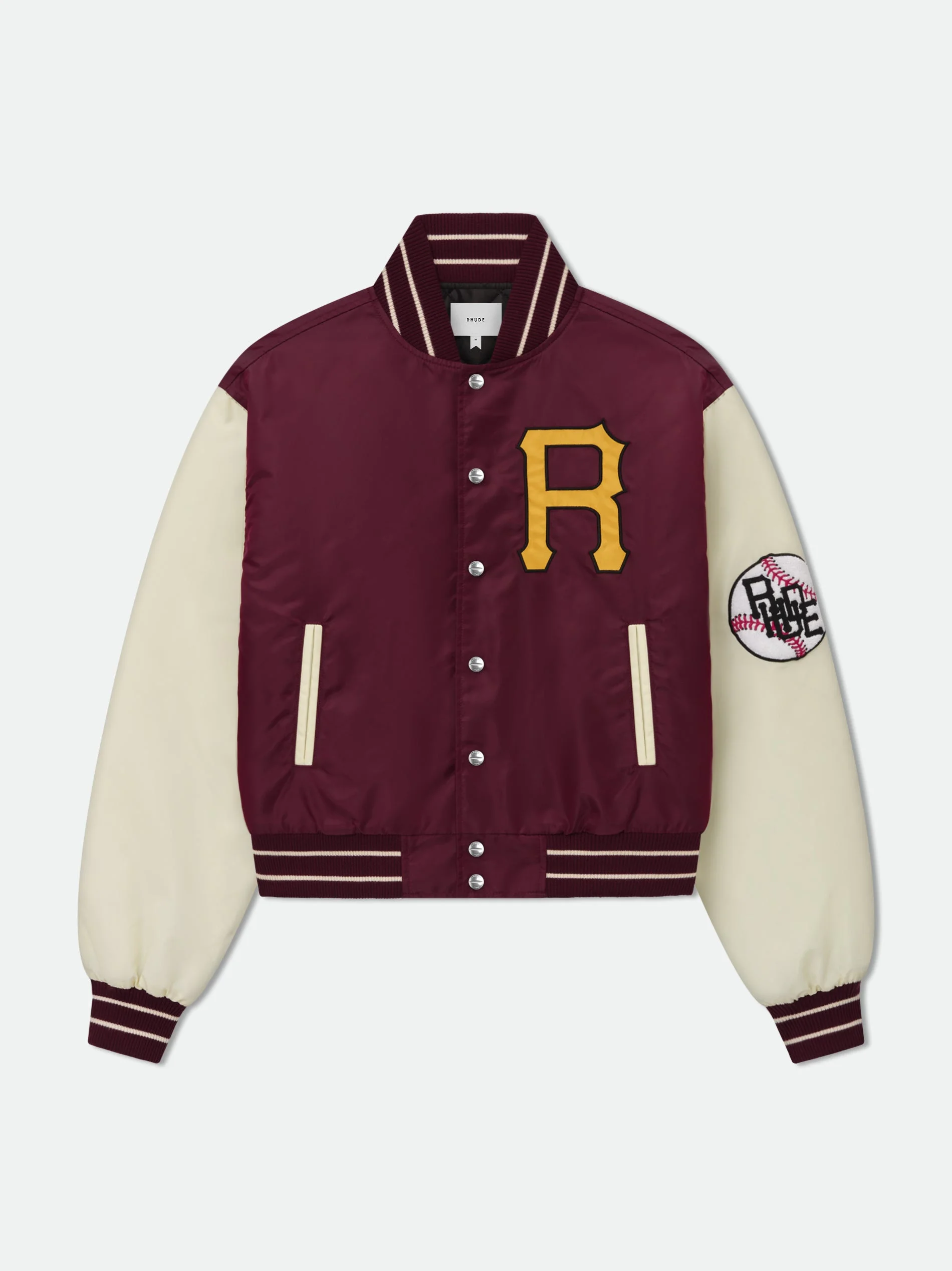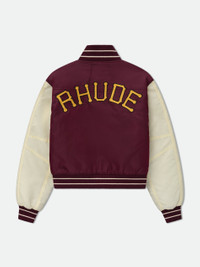 Batting Cage varsity bomber jacket with R embroidered letter on front, with RHUDE logo on the back. Includes a custom Rhude button closures, stand collar, and ribbed waist and cuffs. 100% NYLON