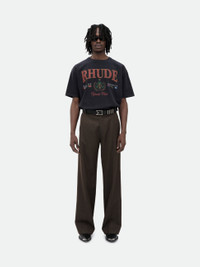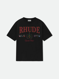 Custom-fit vintage wash cotton short sleeve tee-shirt with Rhude "Bay of Angels" Yacht Club graphics printed at front, with a clean back. 100% COTTON