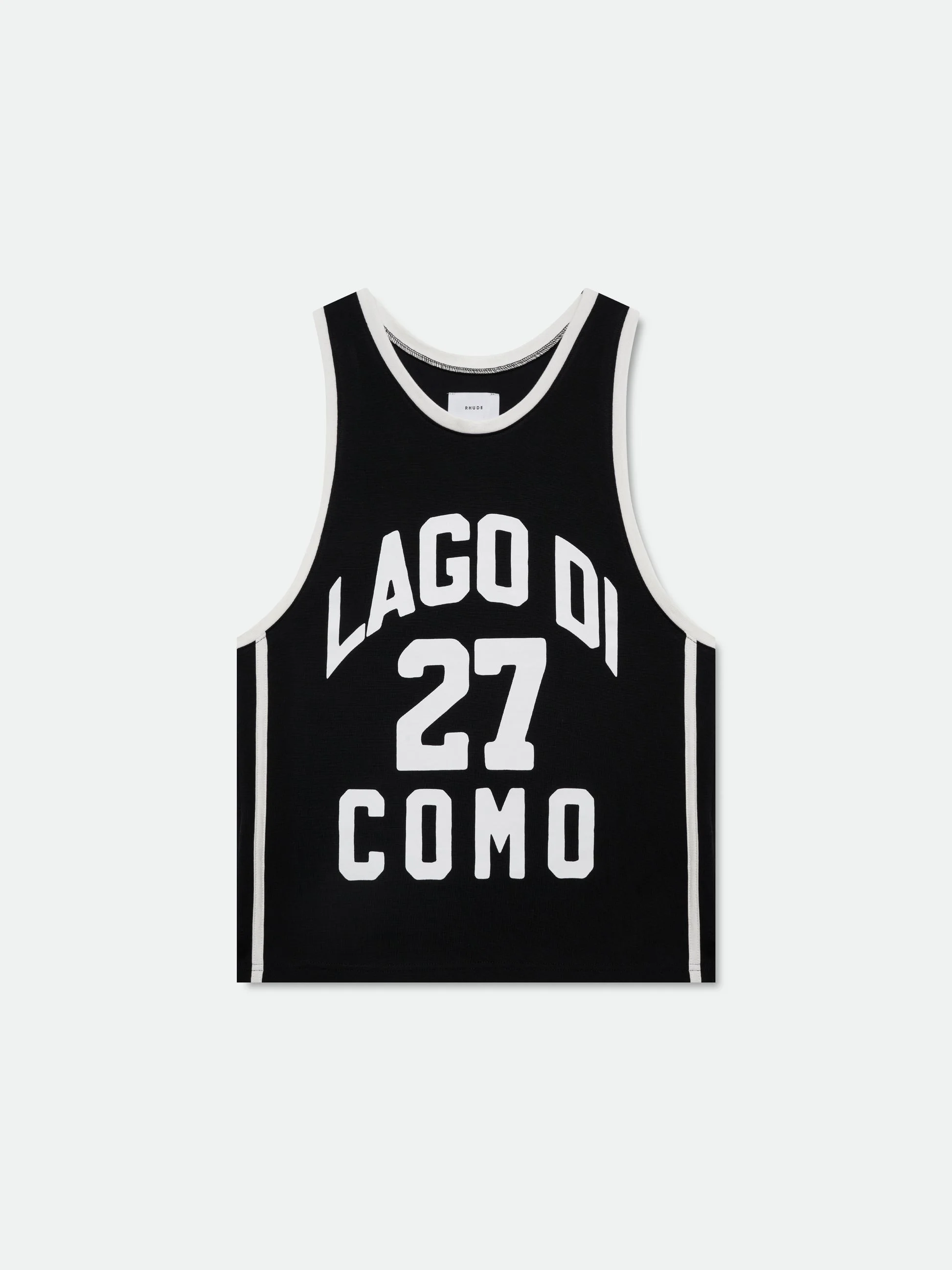 Premium basketball jersey crafted from soft, lightweight fabric. Lago Di Como 27 jersey graphic showcased on the front, with 27 Rhude on the back. Features a comfortable and relaxed custom Rhude fit. 100% COTTON JERSEY
