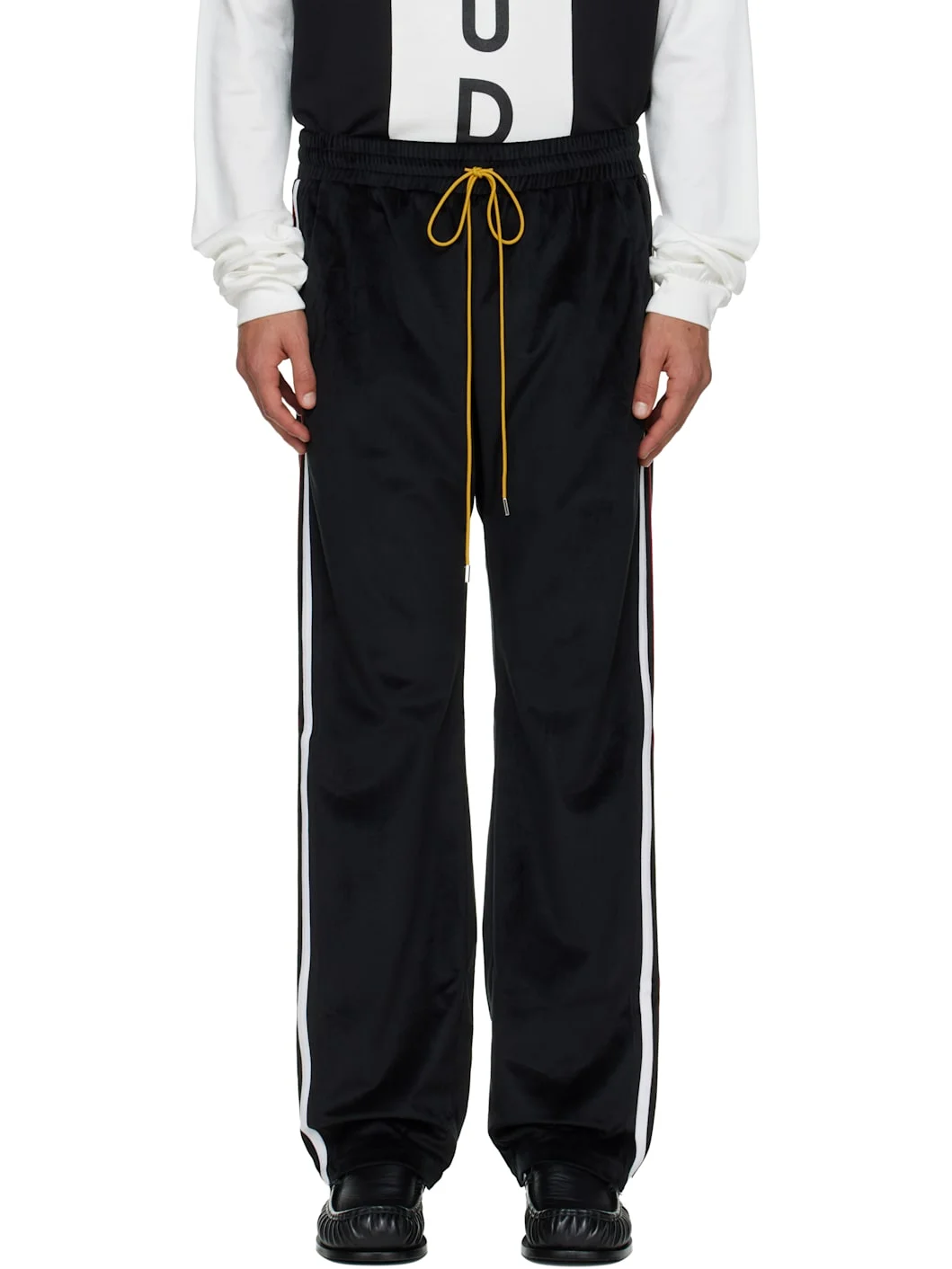 Velour track pants. · Drawstring at elasticized waistband · Four-pocket styling · Logo embroidered at front · Stripes at outseams Supplier color: Black/Red/White Body: 100% polyester. Trim: 85% polyester, 15% spandex. Pocket lining: 100% lyocell. Made in United States 252923M190009