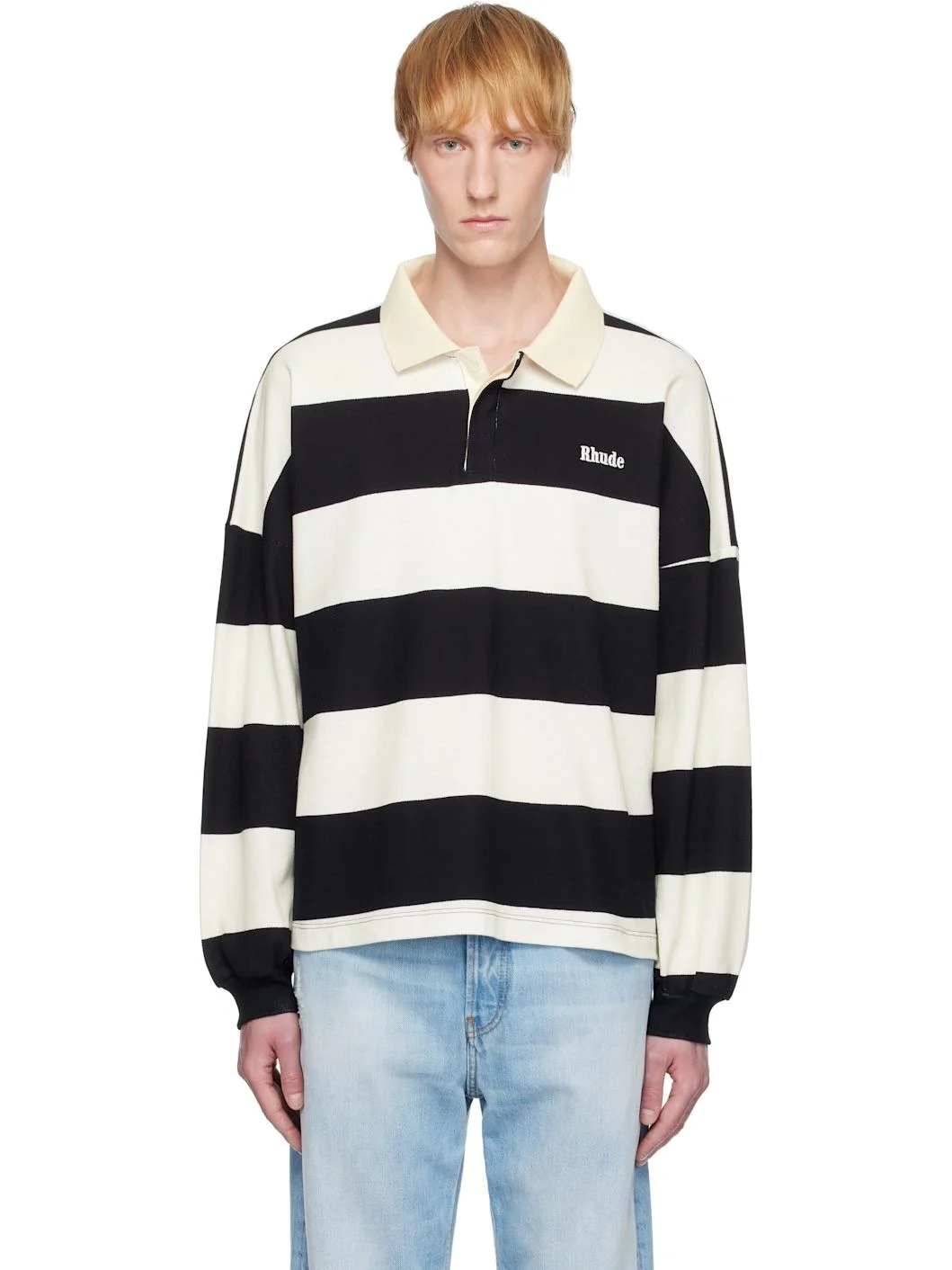 Cotton pique polo. Stripes throughout. · Rib-knit spread collar and cuffs · Concealed three-button placket · Logo embroidered at chest · Tennis-tail hem · Dropped shoulders Supplier color: White/Black Body: 100% cotton. Trim: 100% polyester. Made in United States 252923M212000