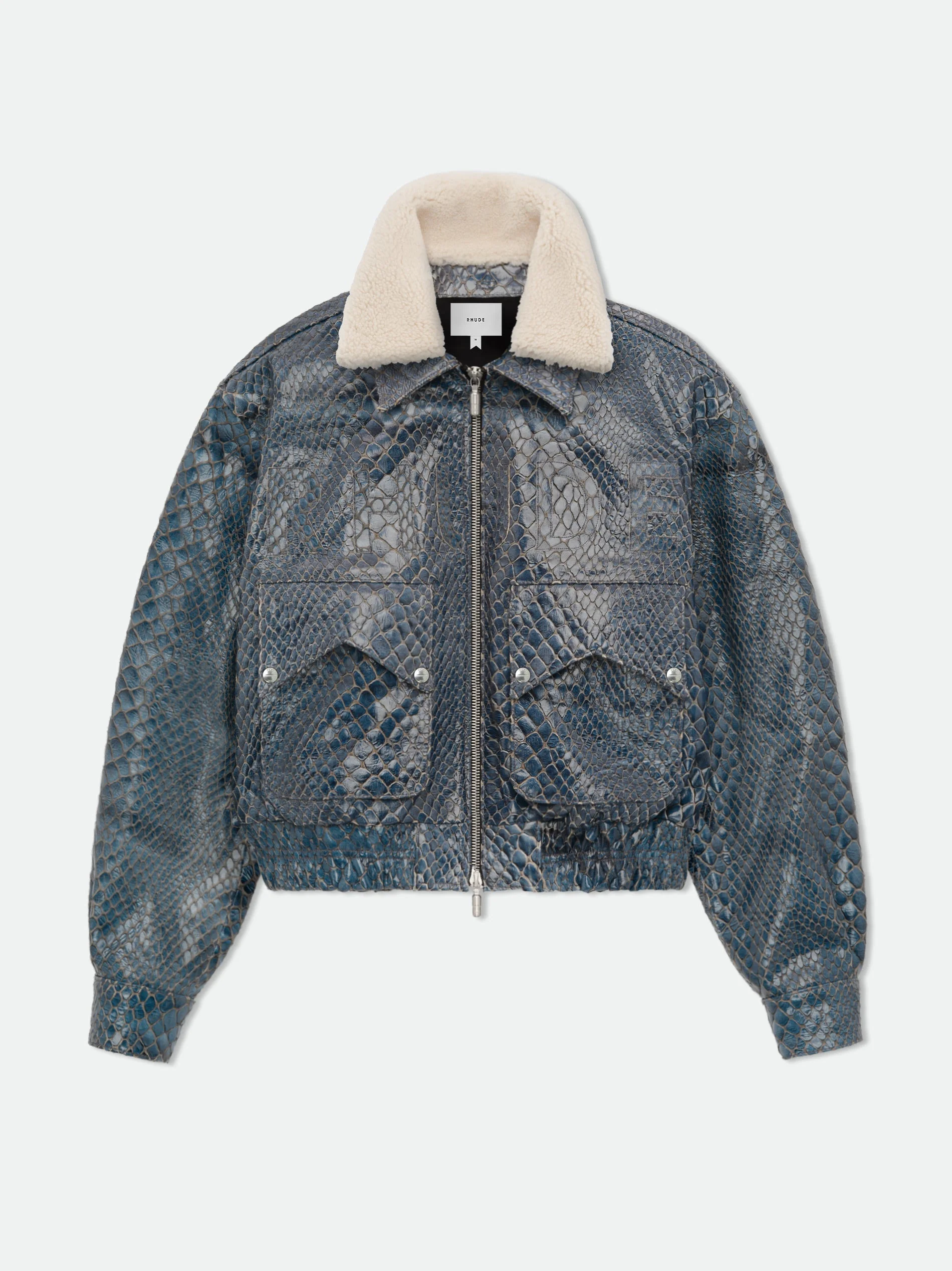 Blue Croc Embossed Leather Jacket with a Sherpa collar featuring "RHUDE" Cutout Lettering on the front. The jacket is equipped with a two-way zipper closure adorned with distinctive Rhude Pill hardware and customized Rhude pill snap closures on pockets and sleeves. AW24 Runway Trunkshow - Delivers in AW24 Season SELF: 100% LEATHER LINING: 100% POLY Dry clean only. Standard fit. We recommend taking your standard size.
