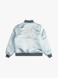 Premium zip up Rhude Boys satin bomber jacket featuring RHUDE BOYS embroidered on back, custom Rhude two-way zipper closure with pill hardware, a stand collar, ribbed waist and cuffs.