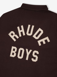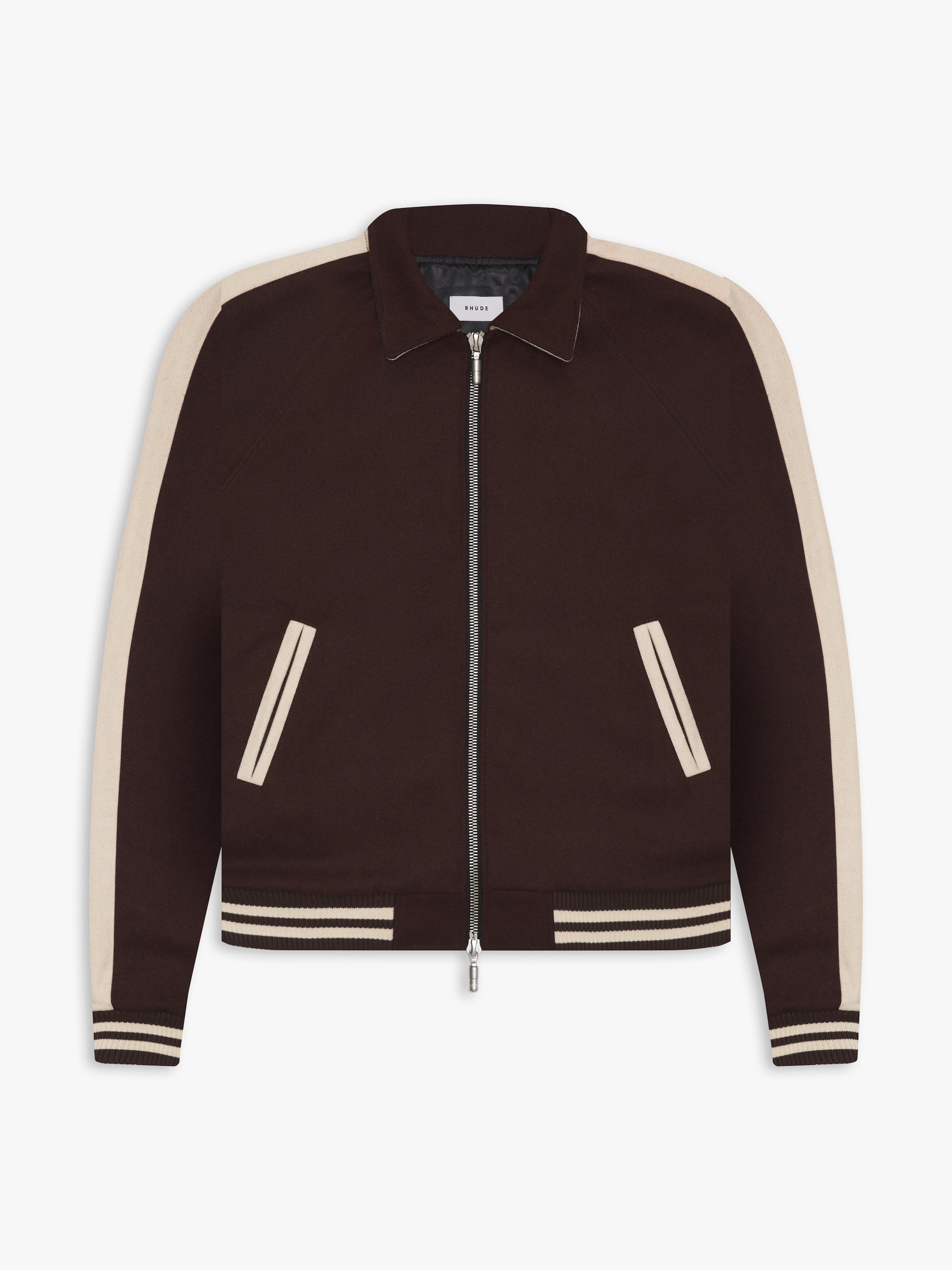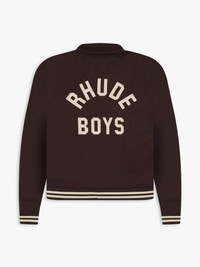 PREMIUM ZIP UP RHUDE BOYS BOMBER JACKET FEATURING RHUDE BOYS EMBROIDERED ON BACK, CUSTOM RHUDE TWO-WAY ZIPPER CLOSURE WITH PILL HARDWARE.A STAND COLLAR, RIBBED WAIST AND CUFFS. CARE SELF: 60% WOOL, 40% VISCOSE RIBBING: 95% COTTON 5% SPANDEX SELF: 84% WOOL, 16% ACRYLIC RIBBING: 100% DRY CLEAN ONLY. SIZING STANDARD FIT. WE RECOMMEND TAKING YOUR STANDARD SIZE.