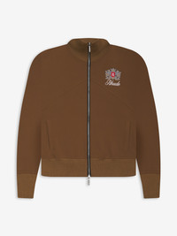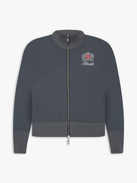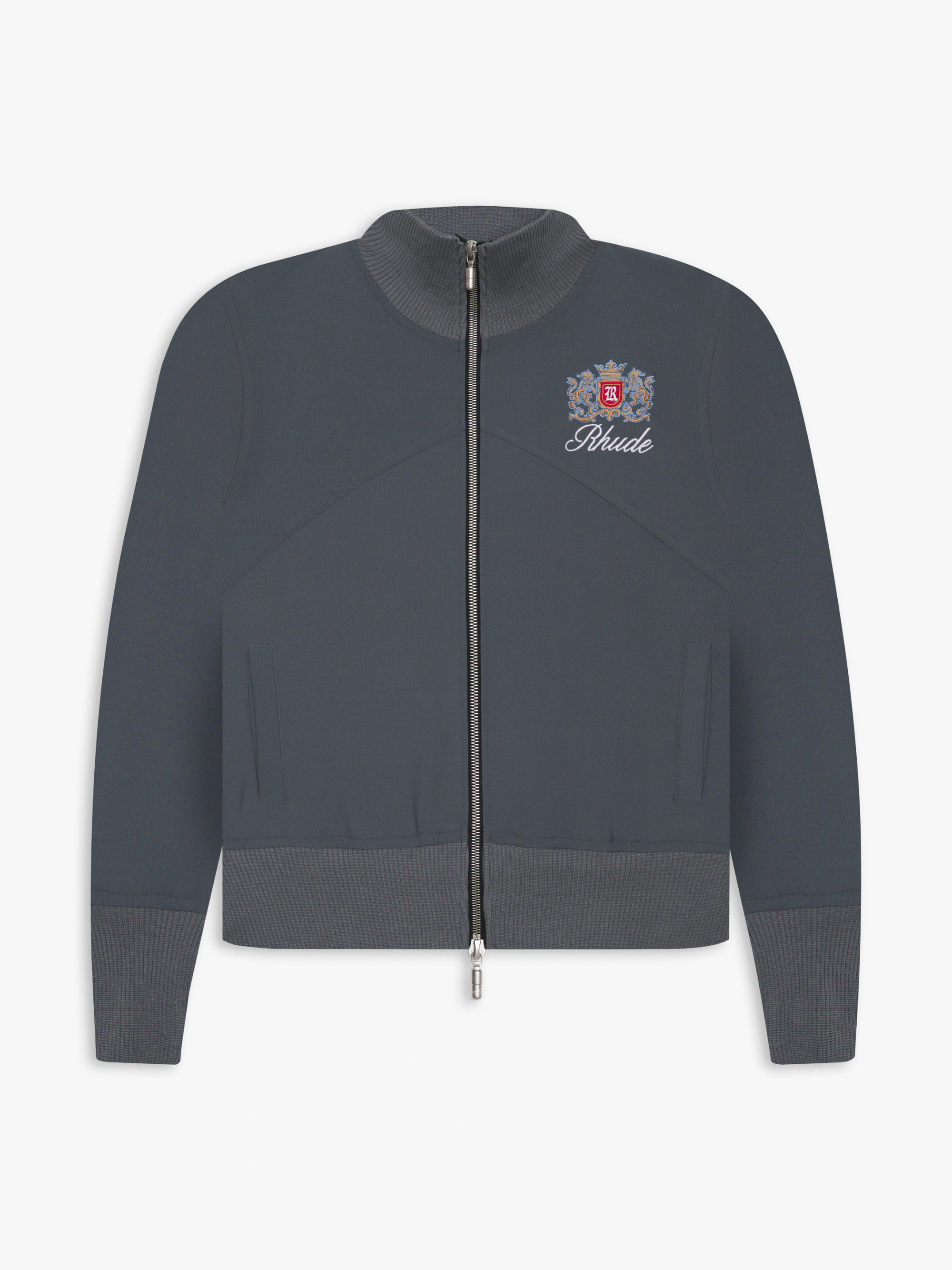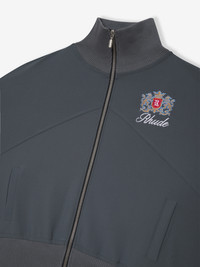 TRACK JACKET WITH A STAND COLLAR, FEATURING EMBROIDERED RHUDE CREST AND SCRIPT LOGO AT FRONT CHEST. TWIN POCKETS AT FRONT. TWO-WAY ZIPPER CLOSURE WITH CUSTOM RHUDE PILL HARDWARE. RIBBED WAISTBAND AND CUFFS. CARE DOUBLE KNIT/2X1 RIBBING WE RECOMMEND TAKING YOUR STANDARD SIZE DRY CLEAN ONLY