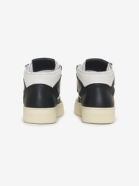 Mid-top sneakers crafted from bicolor leather. These sneakers feature a flat heel and a round toe, providing both comfort and style. The lace-up vamp ensures a secure fit, while the logo label at the tongue + side labeling adds a touch of branding. RUBBER SOLE, 85% UPPER CALF LEATHER 15% UPPER POLYETHERANE 100% LINING PIG LEATHER