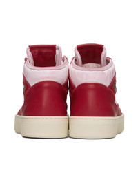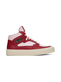 High-top paneled grained and buffed calfskin sneakers in red and white. Fading throughout. · Lace-up closure · Padded tongue and collar · Logo patch at outer side · Leather lining · Treaded rubber sole Supplier color: Red/White Upper: calfskin, leather. Sole: rubber. Made in Italy 231923M236010