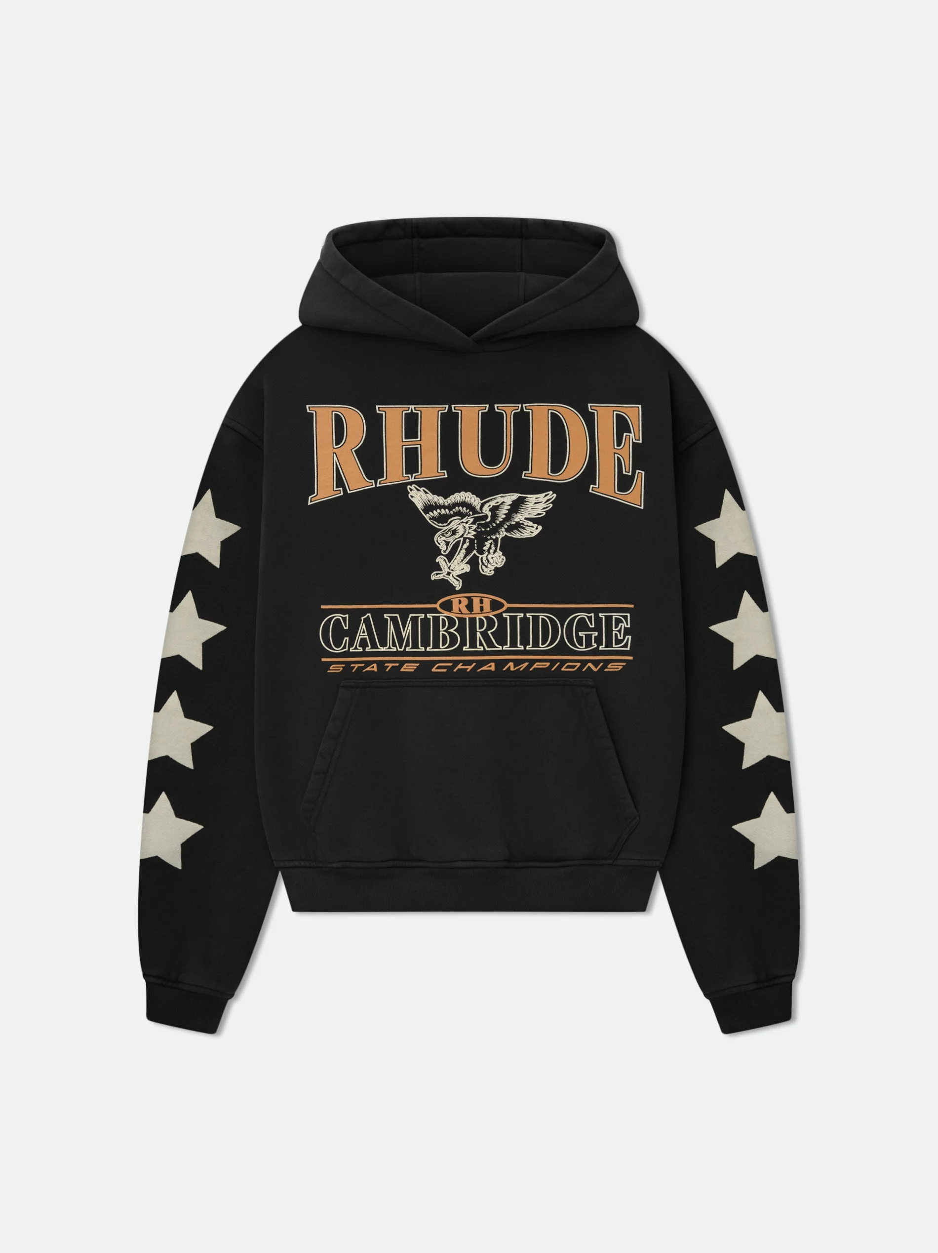 Long sleeve french terry hoodie with Rhude Cambridge graphic designs printed on the front and sleeves, with a clean back. Featuring a kangaroo front pocket and dropped shoulders. Each piece is unique and print distressing my vary per style. 100% COTTON