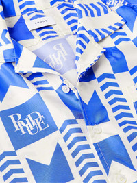 Rhude's shirt is printed with a pattern of chevron arrows and house logos. Cut for a boxy fit from lightweight silk, it's topped with a camp collar and has a single chest pocket. Size & Fit - Fits true to size. Take your normal size - Designed for a boxy fit - Lightweight, non-stretchy fabric - Model is shown wearing a M - Model measures: chest 38"/ 96cm, height 6'2"/ 188cm Details & Care - Blue and ivory silk - Button fastenings - 100% silk - Dry clean
