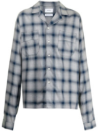 Long sleeve plain-woven viscose shirt in grey featuring check pattern in tones of blue and navy throughout. Open spread collar. Button closure at front. Patch pockets at chest. Single-button barrel cuffs. Mother-of-pearl hardware. Supplier color: Blue 100% viscose.