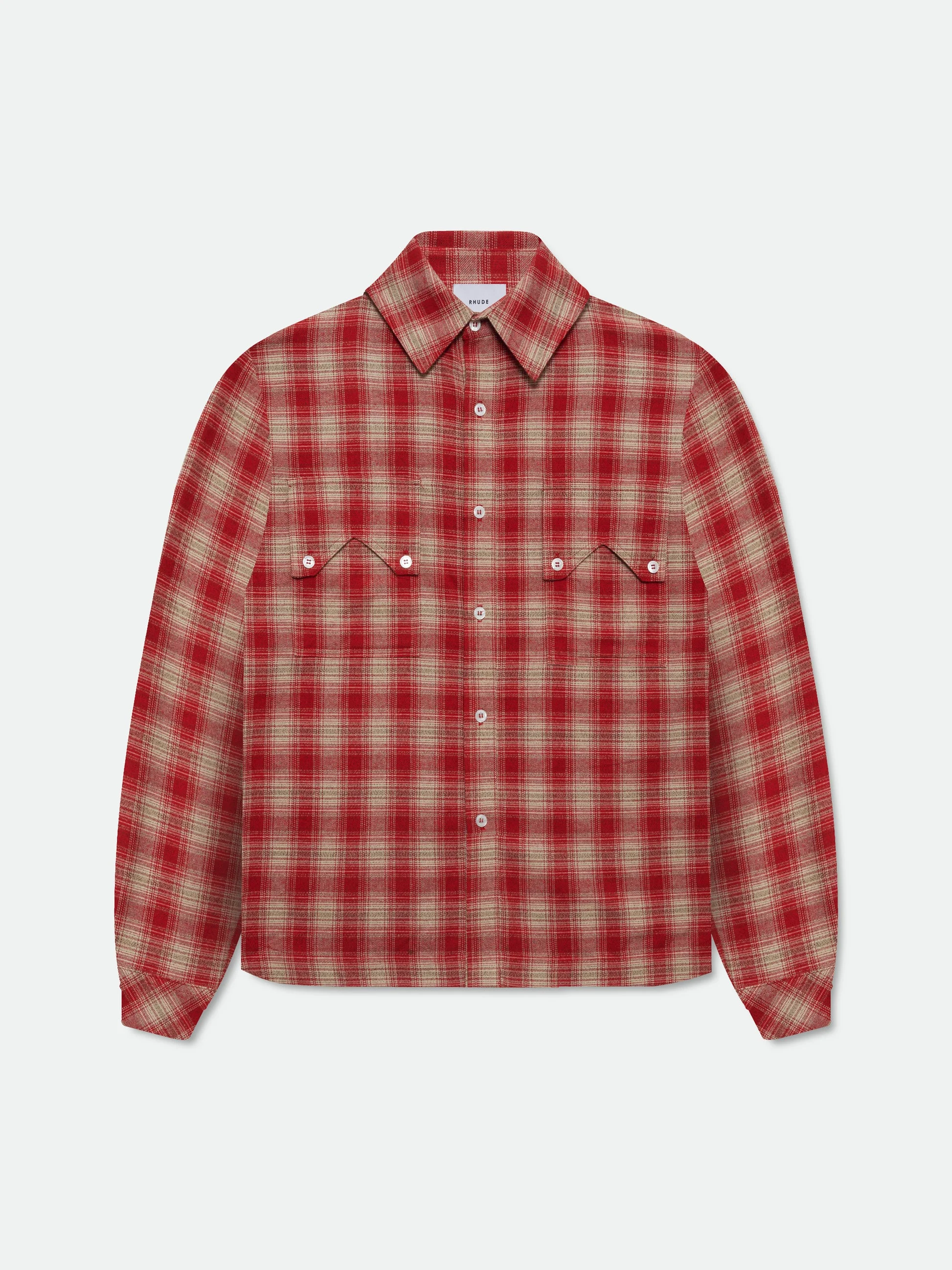 Premium long sleeve shirt crafted from high-quality, mid-weight flannel material. Features a camp collar, dual front chest pockets, custom rhude hardware snap styling, and flat hem. 100% COTTON