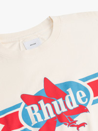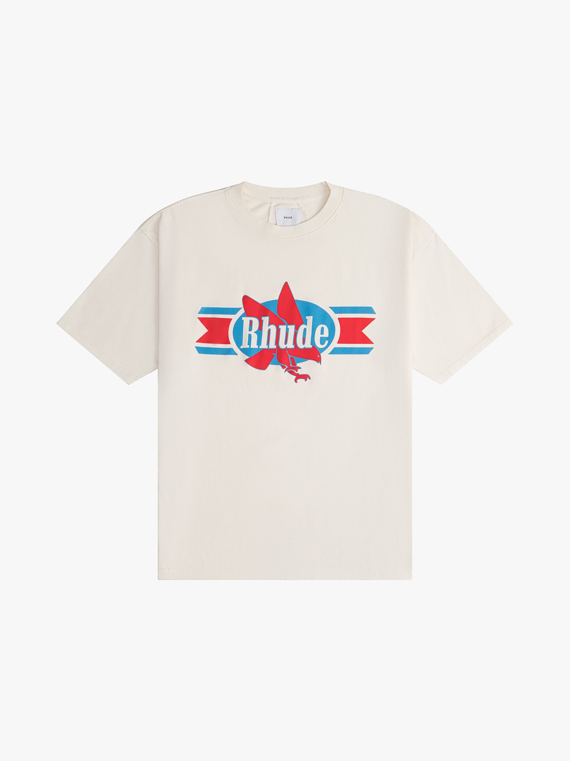 Custom-vintage fit cotton tee shirt with a ribbed neckline and short sleeves. Features RHUDE Eagle within Chevron designs printed on front.